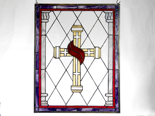 Handmade Stained Glass Gothic Cross Panel: Beveled Jewel Inlay