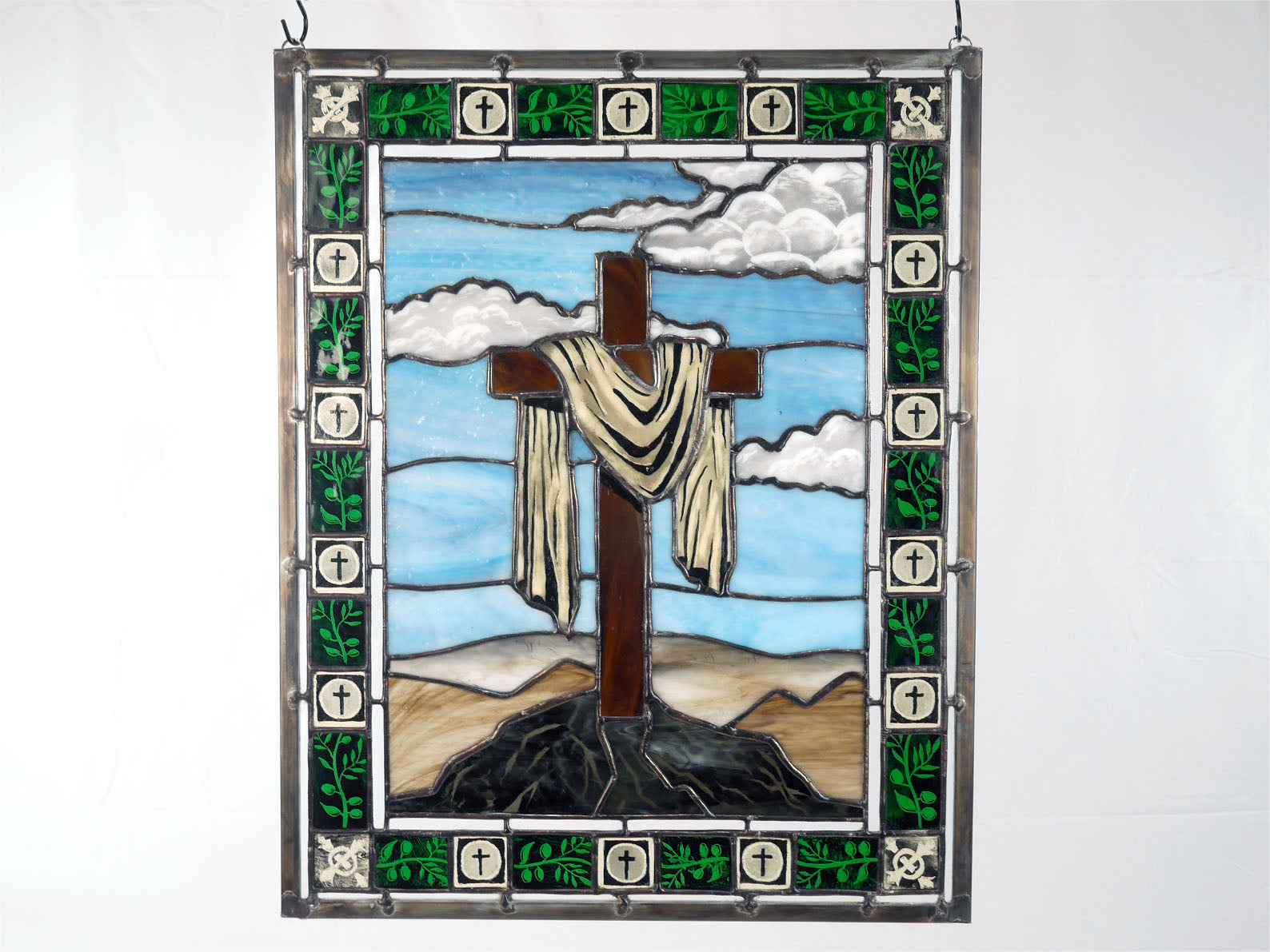 The centerpiece depicts a cross resting upon a rugged rock, enveloped in the fabric of the man who endured its suffering. This somber image is juxtaposed against a serene blue sky, adorned with divine rays emanating from behind one of the clouds. The triple border is a harmonious blend of clean wave glass with the vibrant hues of Easter, featuring each green and yellow element meticulously hand-painted with yellow crosses and green olive branches interwoven into the design.