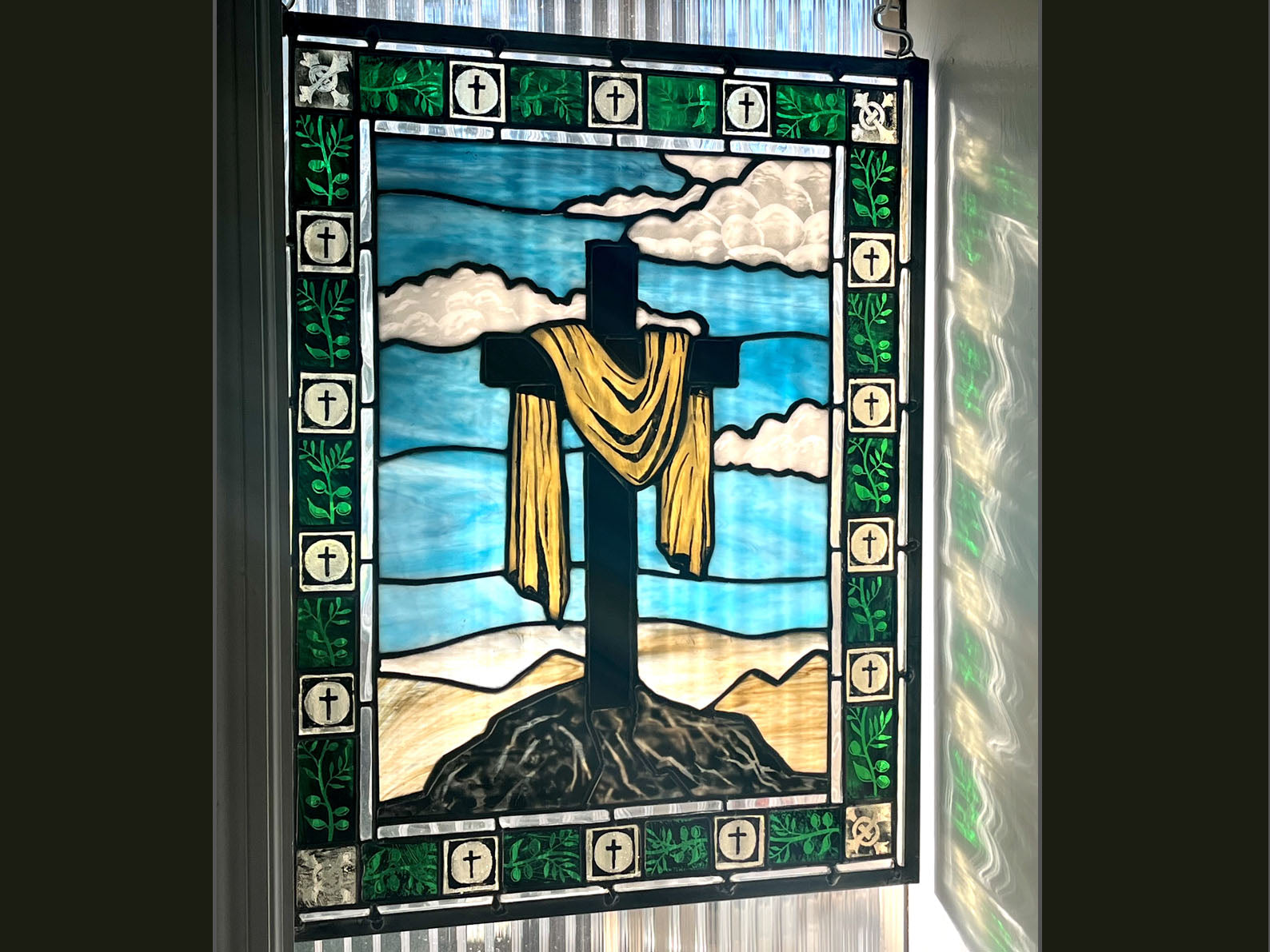 The Rock of Remembrance, Handmade Painted Stained Glass Cross Panel: Easter Theme,
